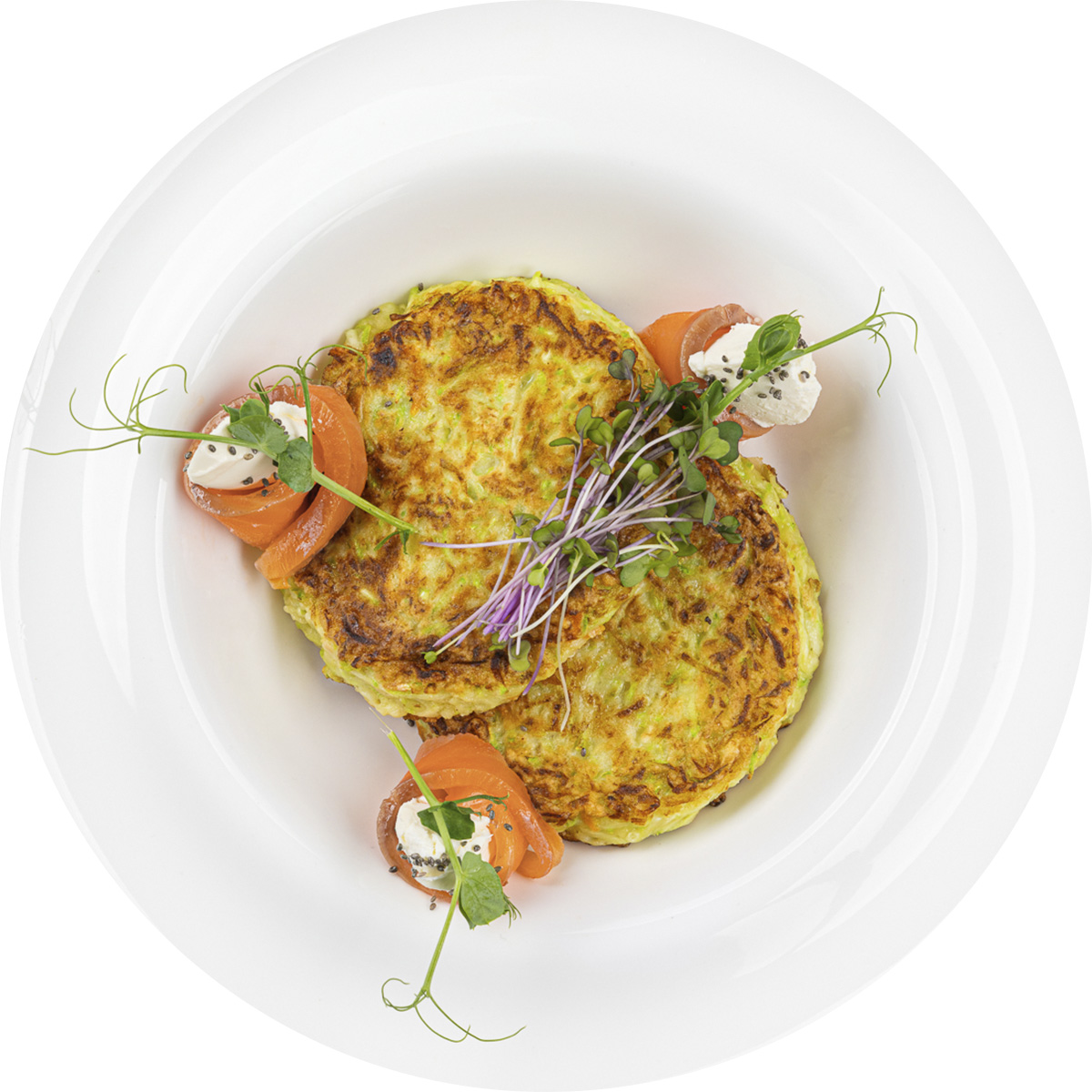 Оладьи из кабачков, лососем шеф-посола и соусом Дзадзики