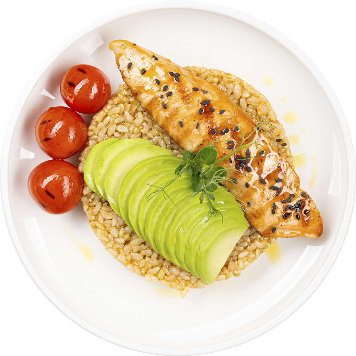 Лосось на гриле с бурым рисом, зеленью и авокадо