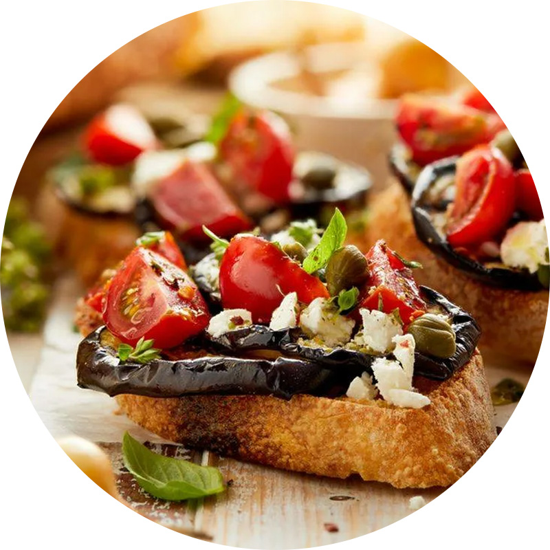 Брускетта с печеным перцем, хрустящим баклажаном и кремом из рикотты